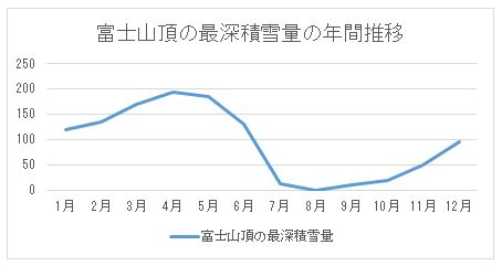 私は、気象予報士でも気象学の専門家でもないのであまり詳しいことは書けませんが、これまでの統計で言うと富士山頂の最高気温が初めて0度以上になるのは、毎年4月下旬のようです。そしてこの頃に毎年最も多い積雪量を記録しているみたいです。ただし、毎年「絶対に」春になると雪が多いというわけではなく、例えば1971年なんて1年間で最も雪の多かったのが5月の記録なのですが、たったの60cmです。雪の多い年と極端に少ない年があるというのも、日本一の富士山が故の振れ幅なのでしょうか…?