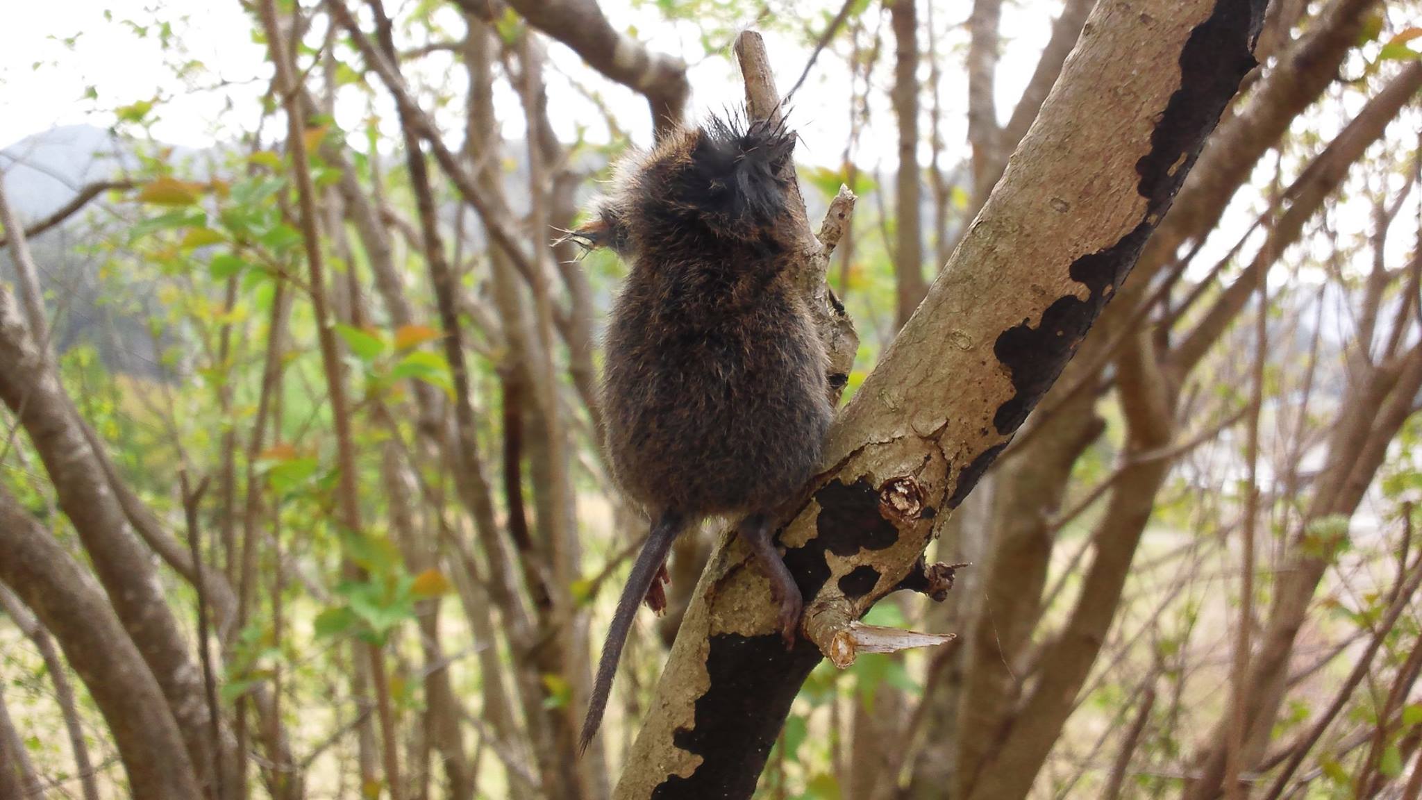 2枚目の写真はモズという鳥の「はやにえ」です。森に生息しているネズミの頭が食いちぎられていますね(ちょっとショッキングな写真ではありますが、自然の営みそのものですのでご容赦を!)。モズという鳥はご存知のように漢字で「百舌鳥」と書くように、様々な鳥の鳴きまねをしたりすることができる小さな鳥です。富士山周辺に生息しているモズたちは、晩秋から春にかけて里山の比較的低いところで越冬しているのがよく観察されます。この「はやにえ」は、獲物を樹木の枝など尖ったところに串刺しにするモズ独特の習性です。この習性の理由はよくわかっていませんが、その季節に初めて捕えた獲物を生贄として神に捧げているとか、お腹が空いていない時にも本能的に狩りをしてしまい、食べるのを持て余して刺してしまうとか、春に昆虫たちが多く飛び回るまでの保存食であるとか、鋭いくちばしで捕えるのは得意だけど、脚の力が強くないから枝に刺してフォーク代わりに固定して食べているなど、とにかく色々な説があります。