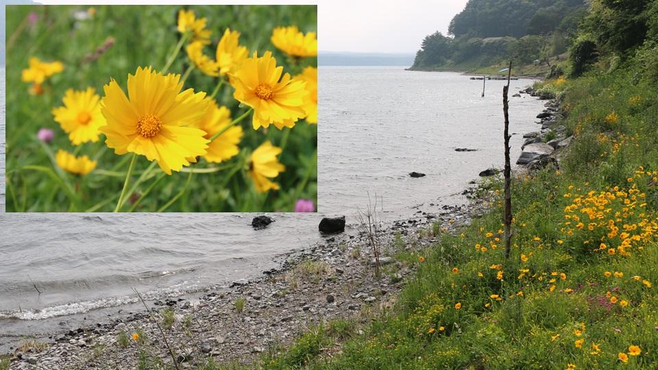 西湖畔に咲くオオキンケイギク(左上は拡大写真) 2014年6月20日撮影