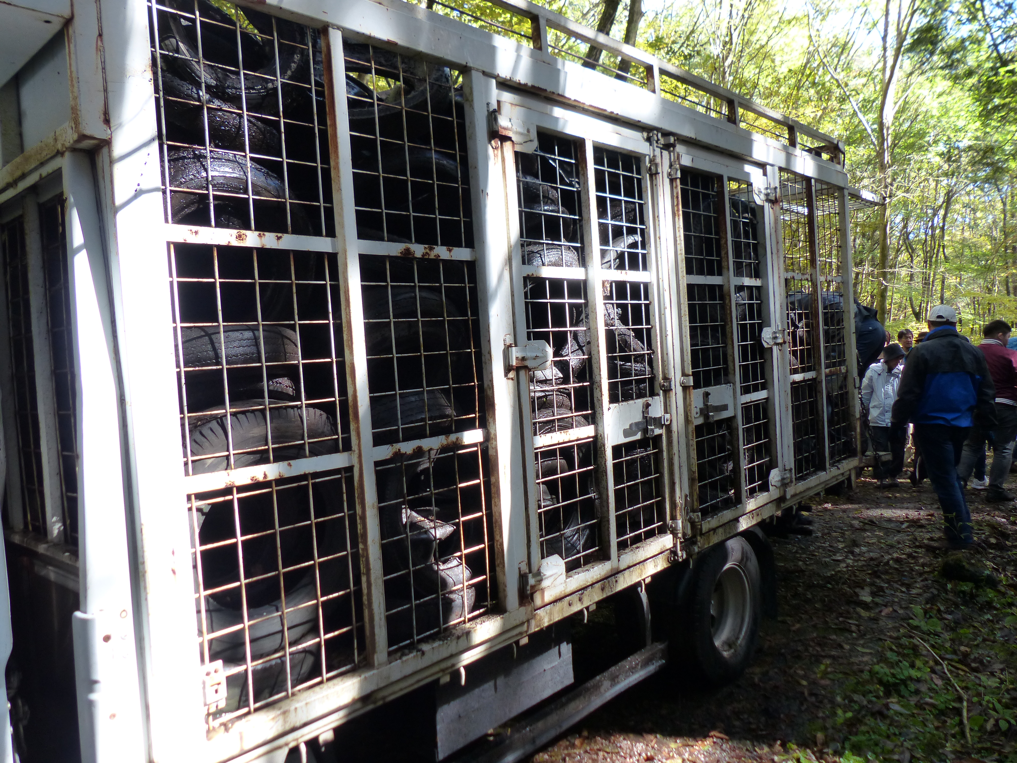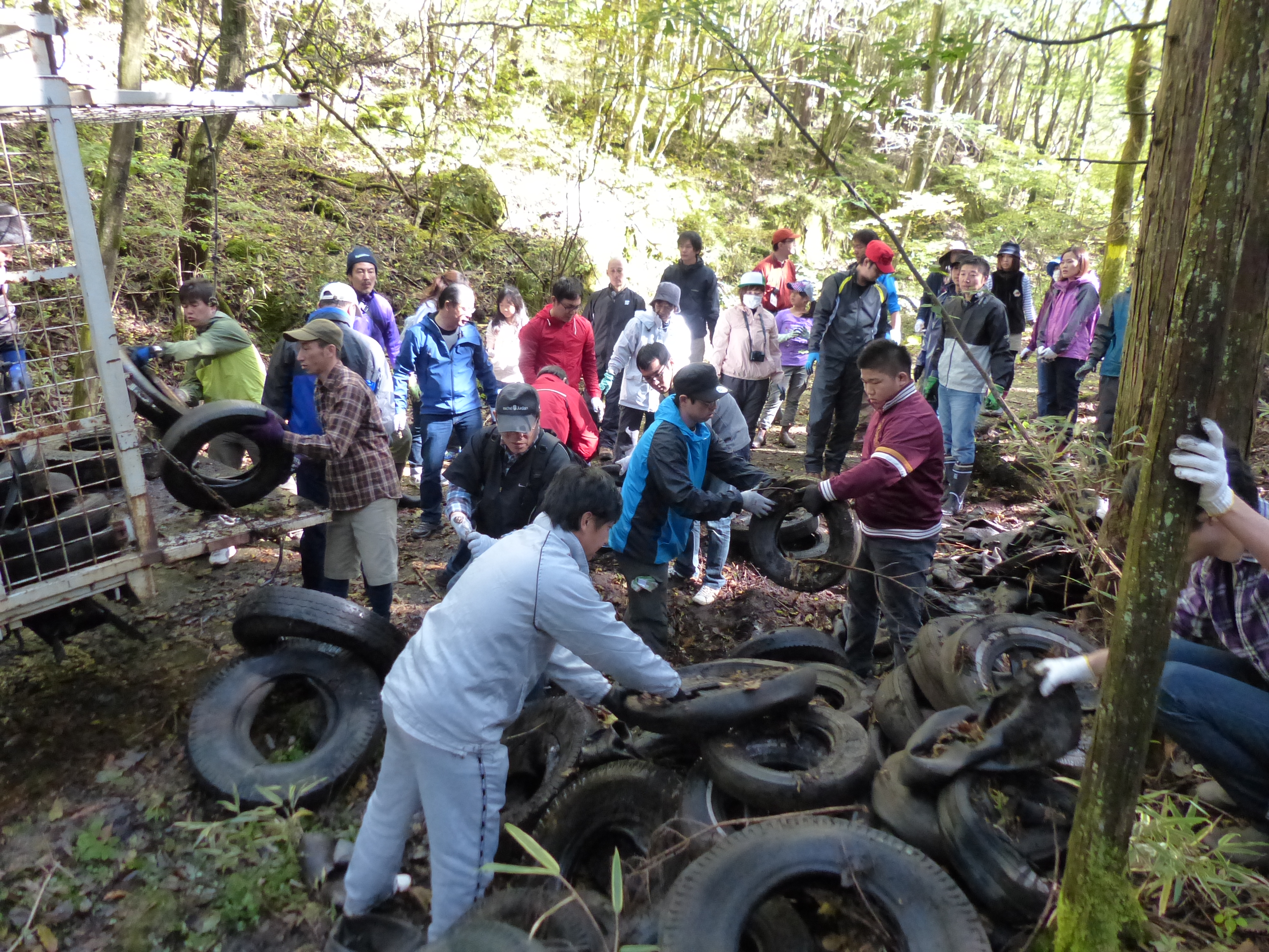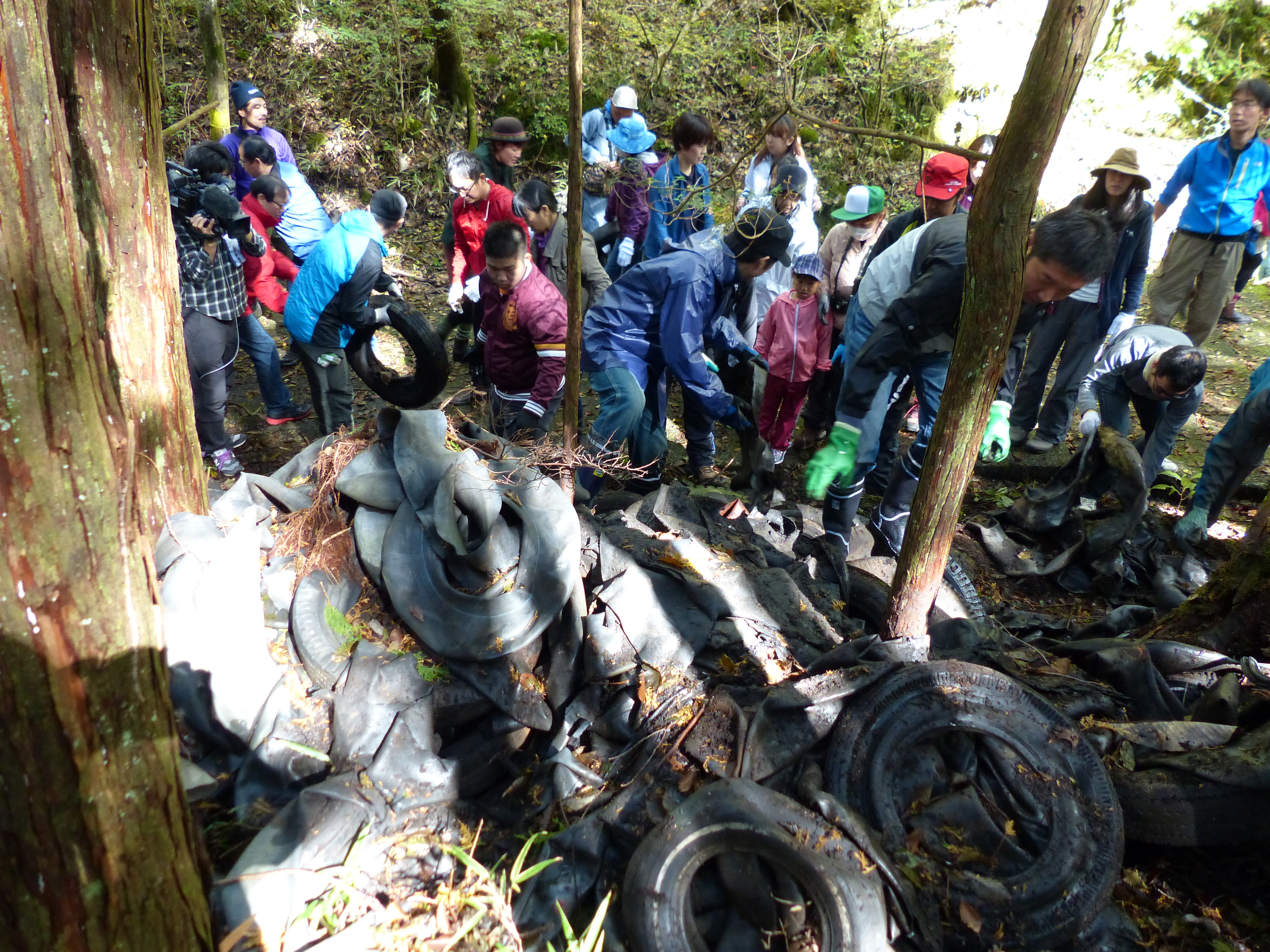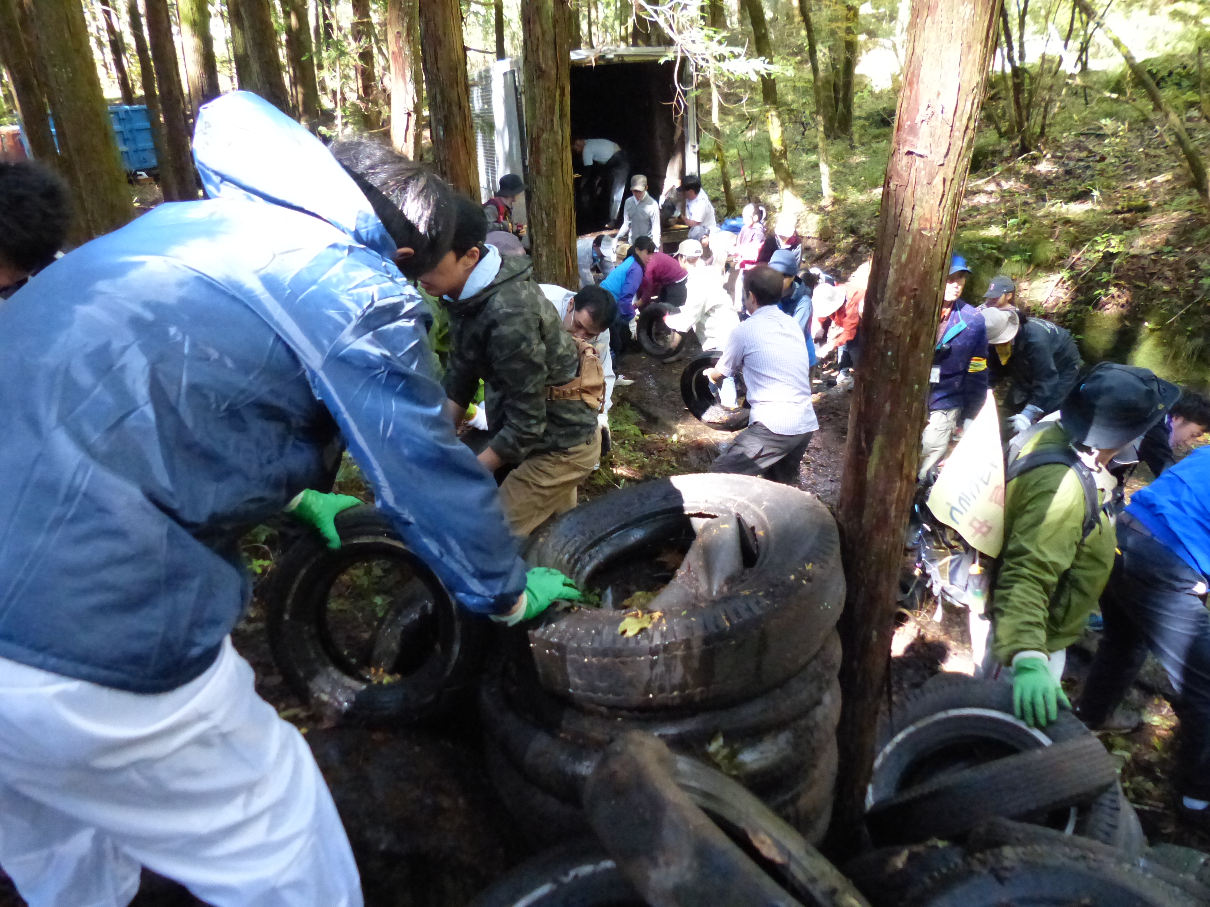 そして3・4号車の参加者の皆さまには、開会式後、昨年掘り出したものの、想像以上の量で積み切れなかった残りの不法投棄タイヤの撤去作業に入って頂きました。