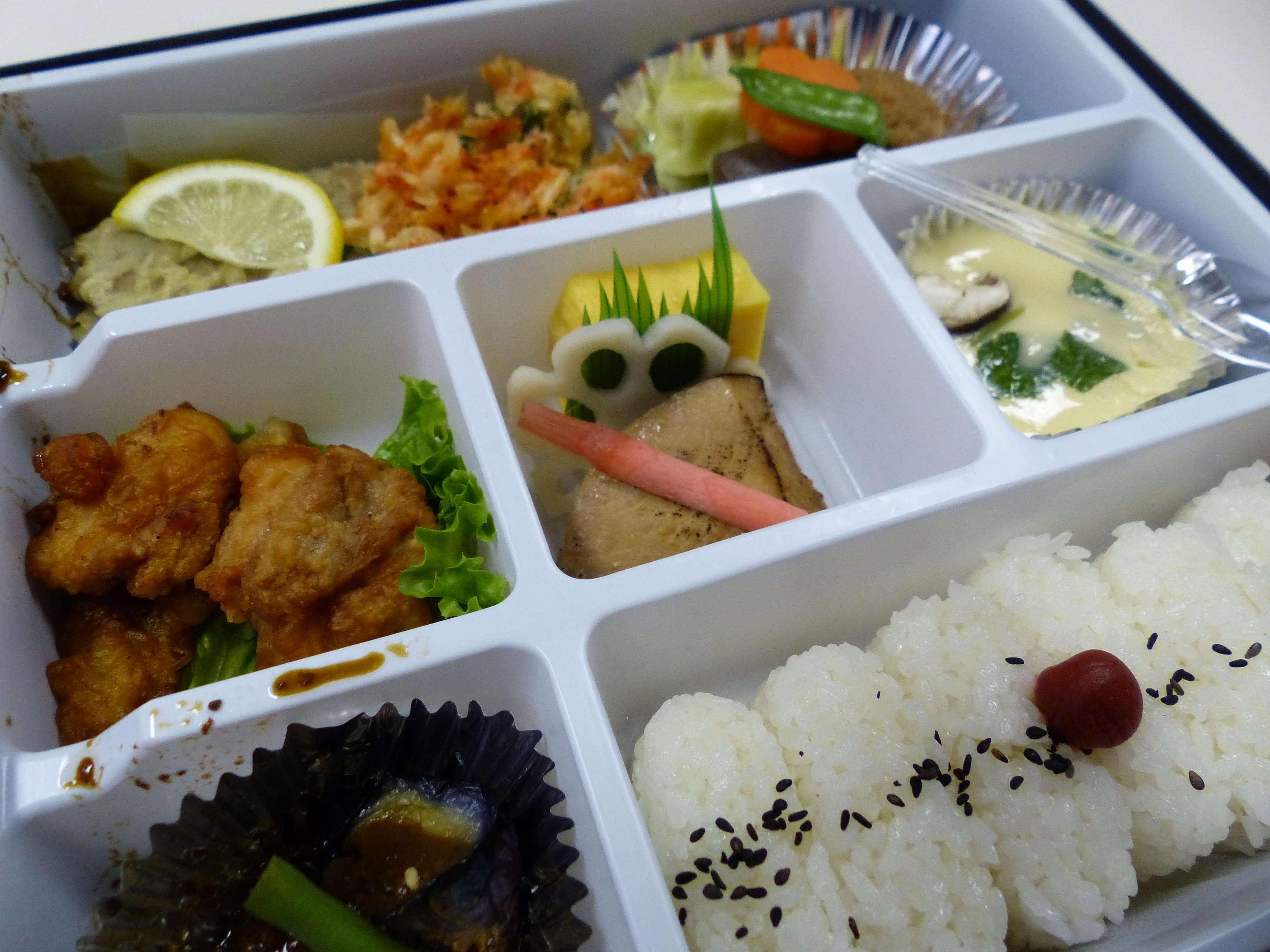 (みんな大好きな唐揚げなどに加え、はんぺんフライやサクラエビのかき揚げも入ったお弁当☆)
