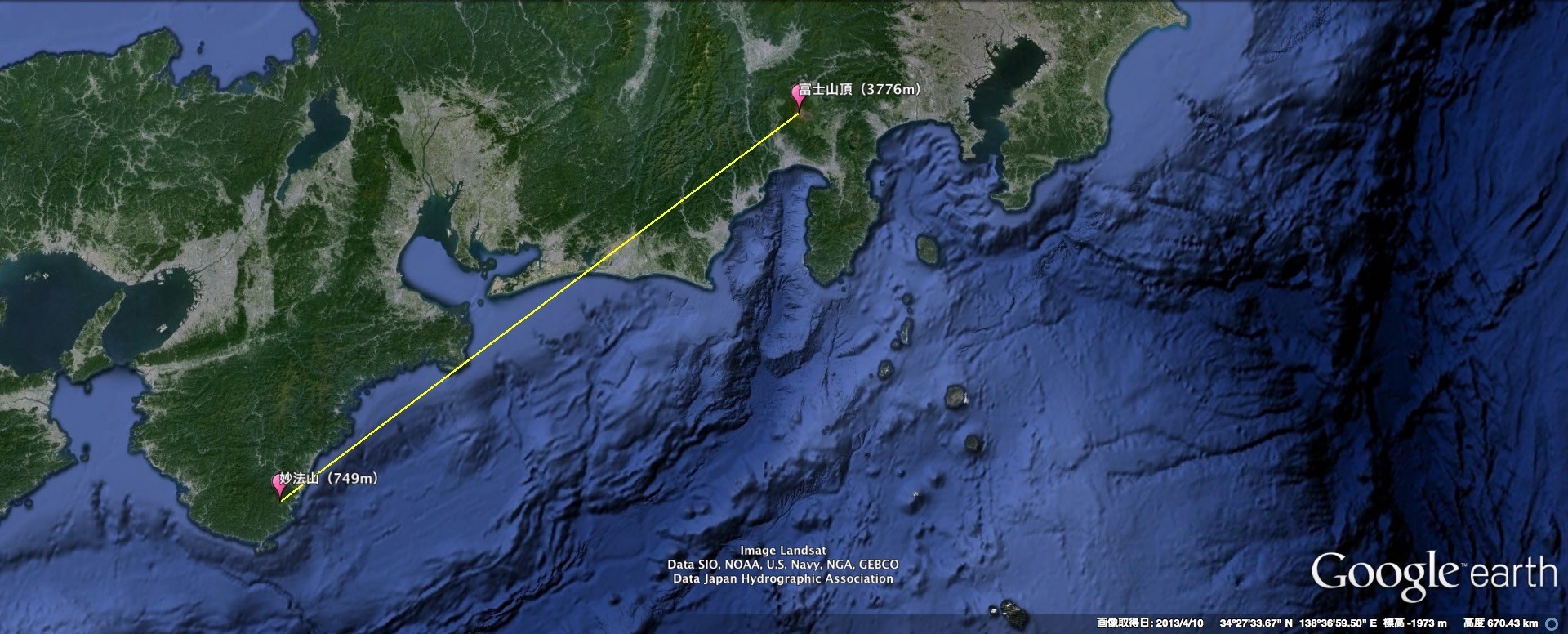 妙法山(みょうほうざん)という山から見えるそうです。私はまだこの地を訪れたことはありませんが、和歌山県の著名な写真家の方が、撮影に成功されたそうです。伊勢志摩の湾の遥か向こう側に富士山の円錐が水平線上に…嗚呼、なんとうらやましい!!ぜひとも行って登って見たいですね。