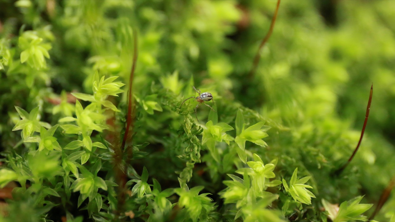 美しいコケの上を歩く小さなクモ(2015年4月24日撮影)