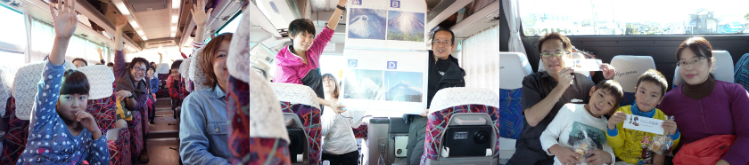 車内では、富士山クイズが始まり盛り上がる。正解者にはヴィノスヤマザキさんから沢山のワインのプレゼントが!