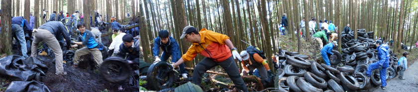 いざ、清掃活動開始。想定外だったのは、タイヤは見えている部分の下にも大量に埋まっていて、全部掘り起こさなければならなかった事でしたが、野口健さんの気合いと励ましも有って、全員一致協力のもと、過去に類を見ない大量の不法投棄ゴミを収集清掃する事が出来ました。